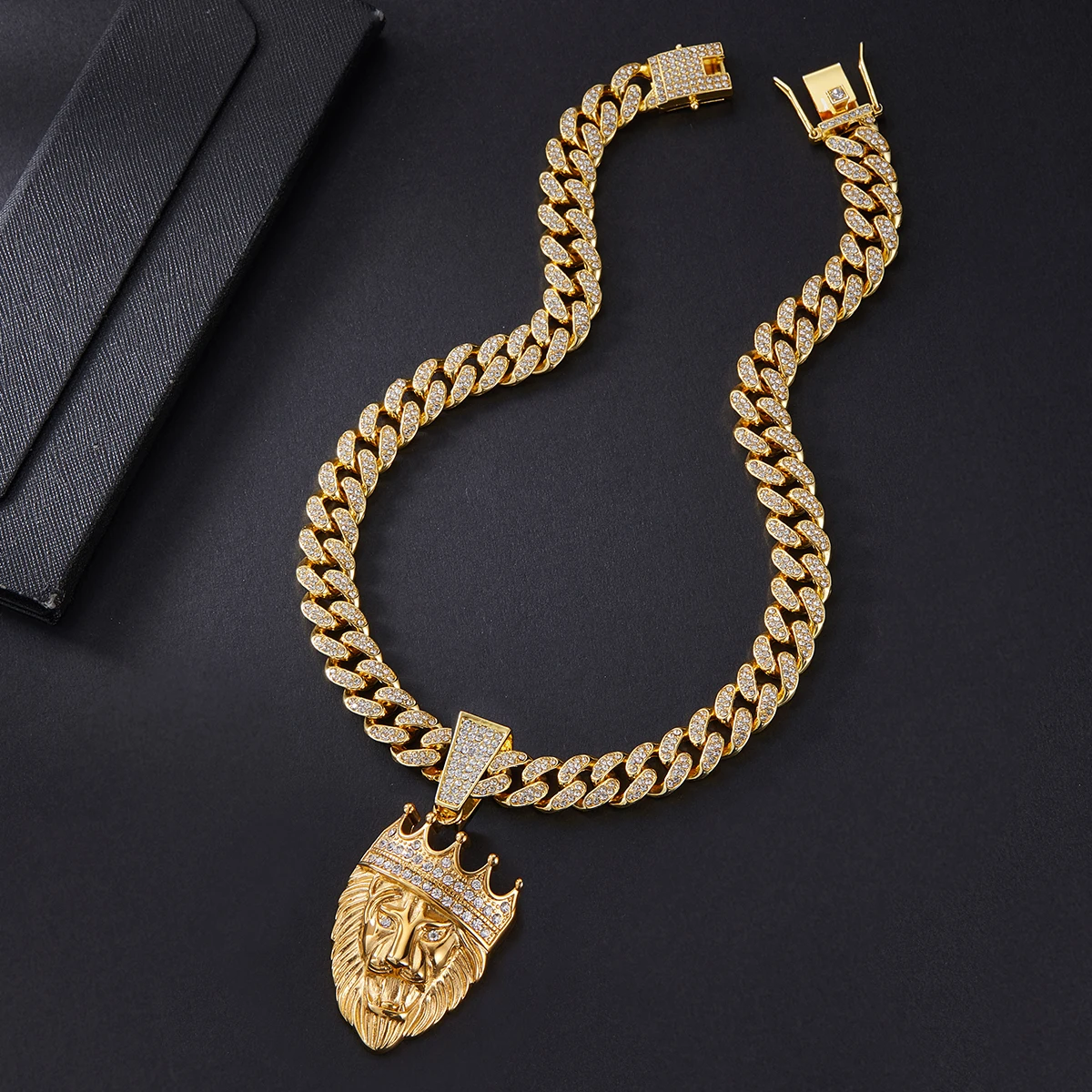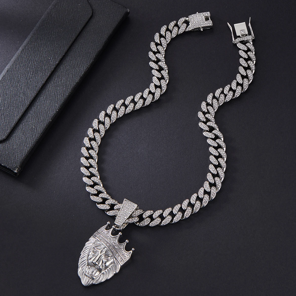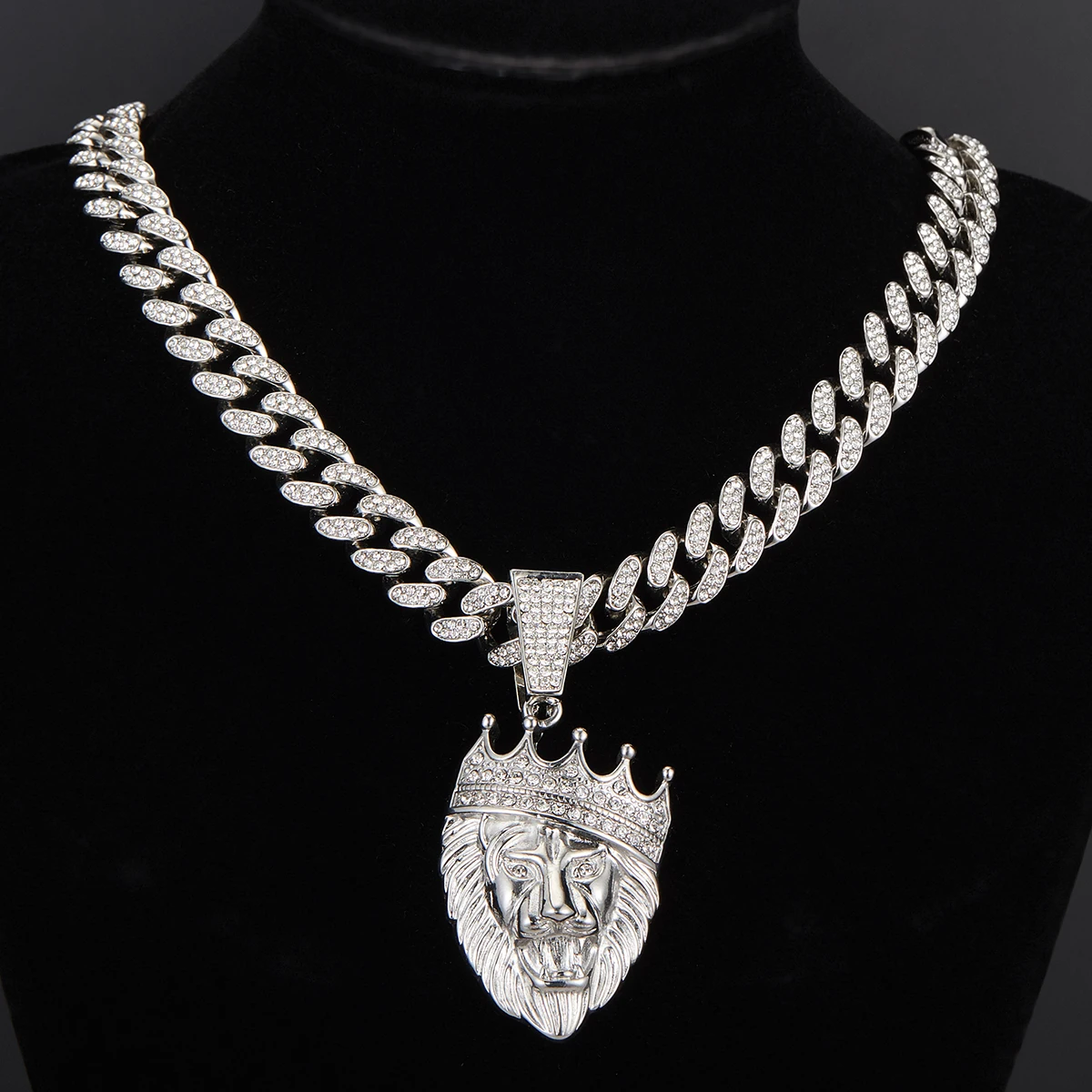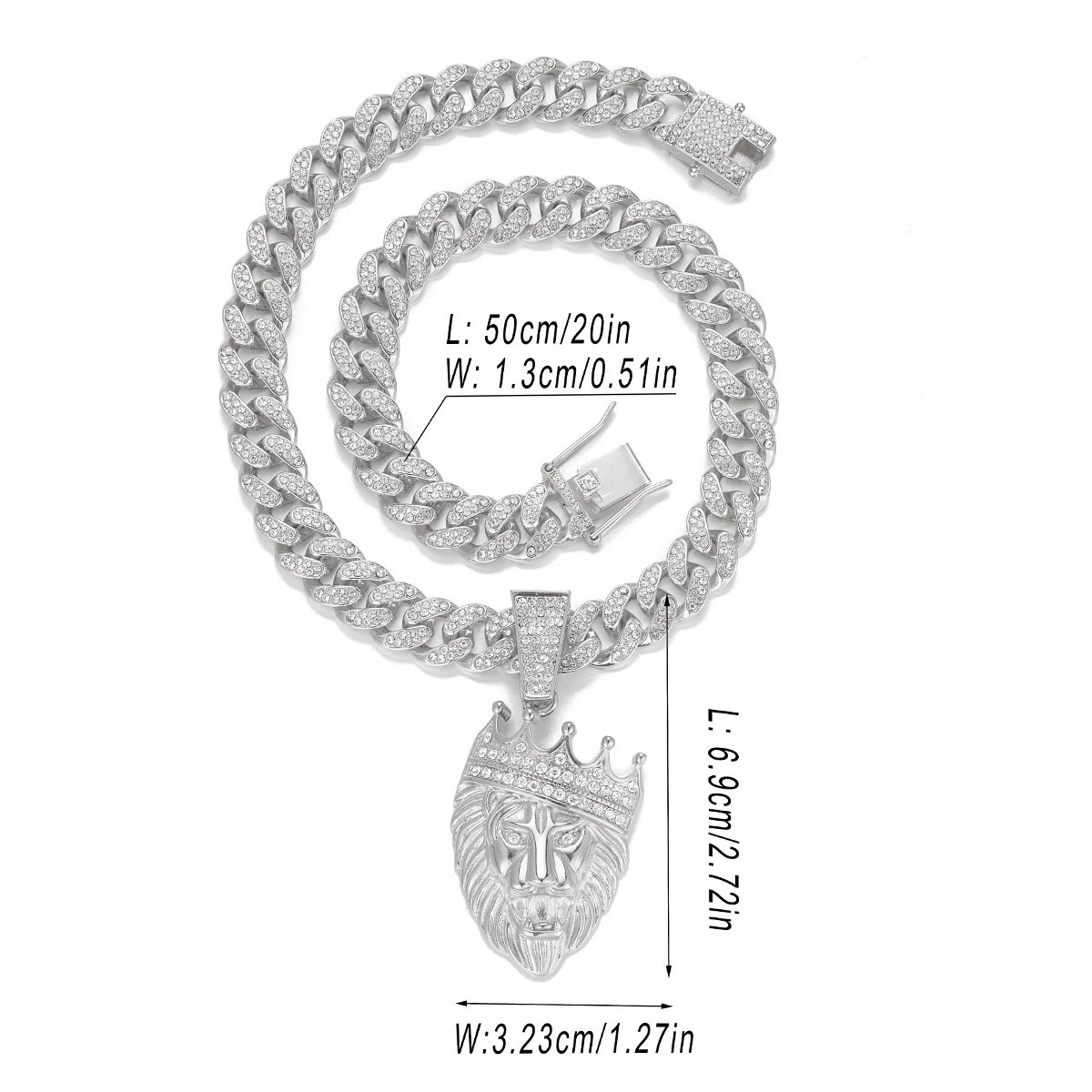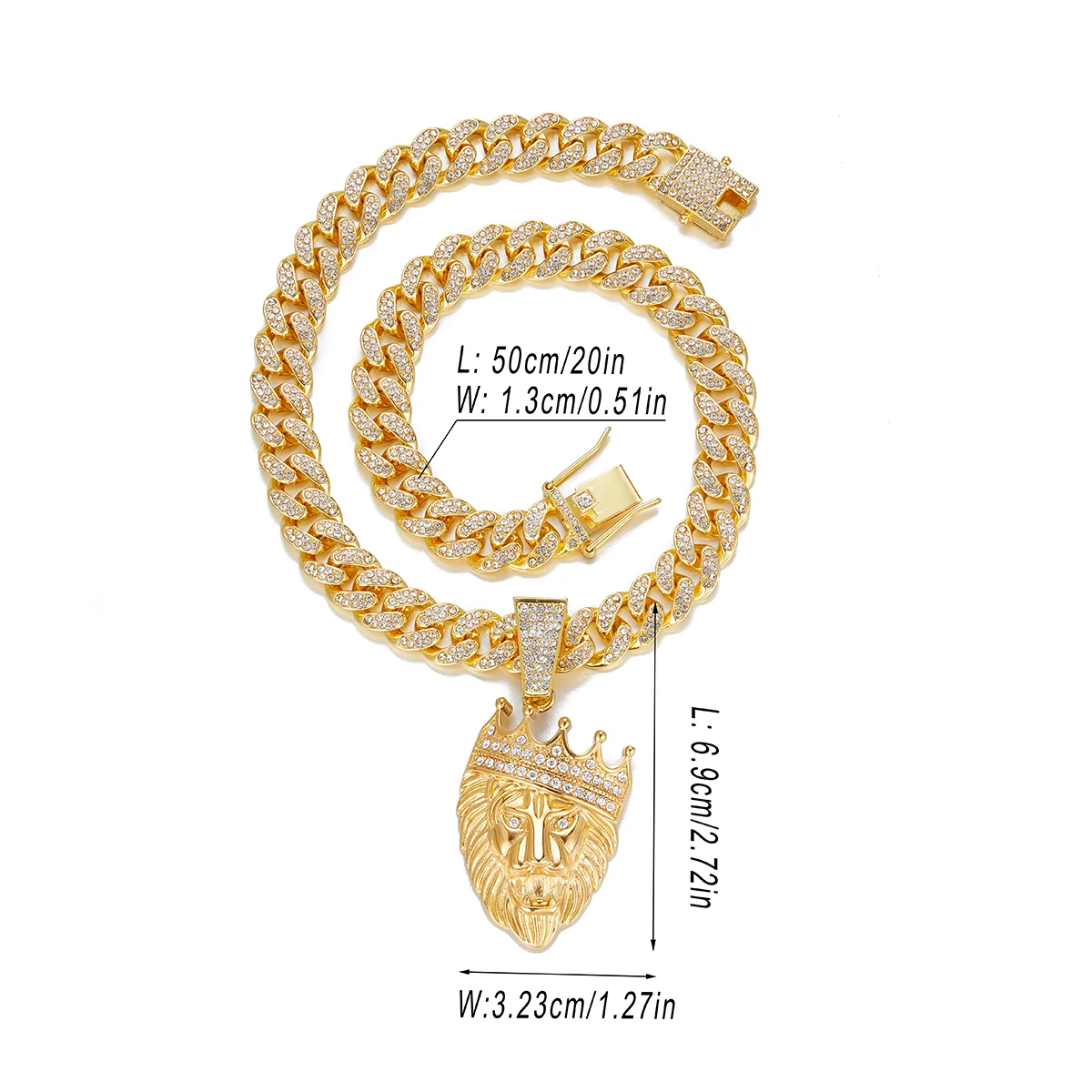 Crown Lion Head Pendant Necklace Iced Out Clear Rhinestones Curb Cuban Chain Stainless Steel Necklace Jewelry Gift