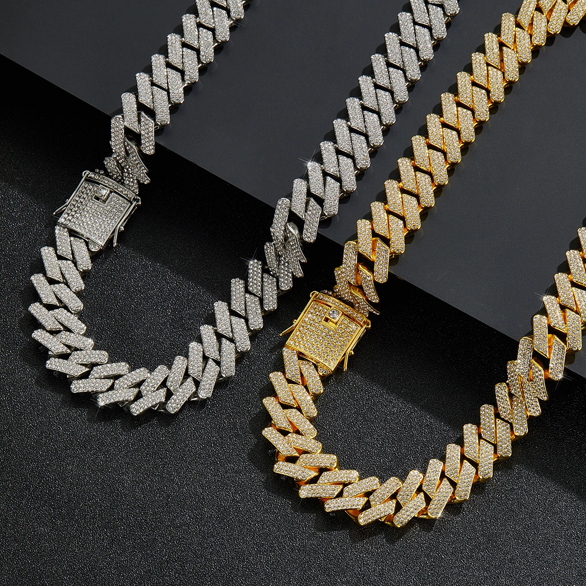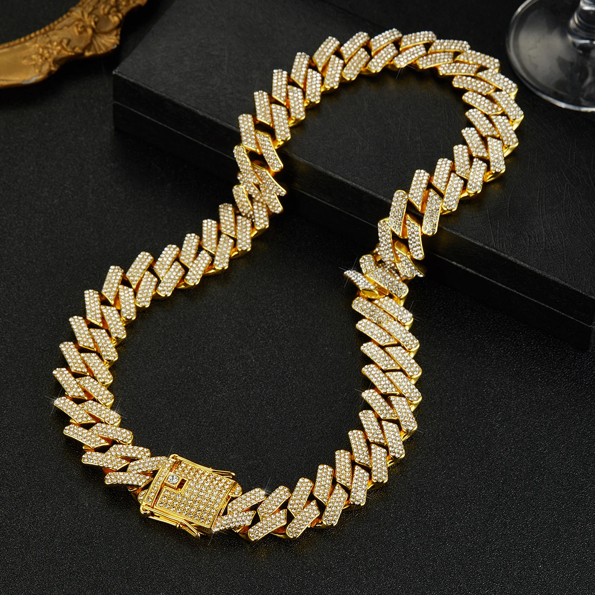 Hip Hop 18MM prong Miami Cuban Chain Jewelry Shiny 3-Row Rhinestones Pave Necklace Party Accessories for Men and Women Gifts