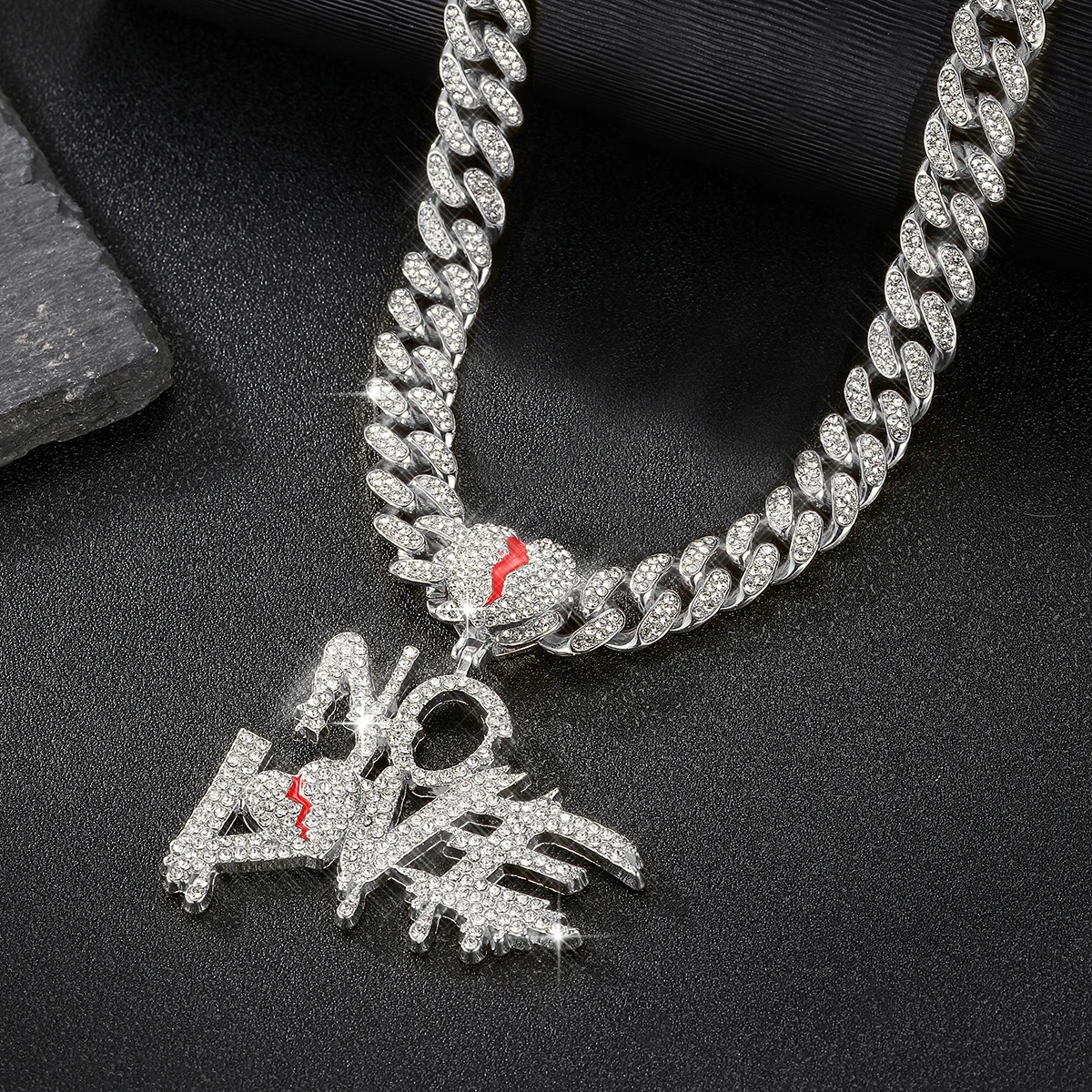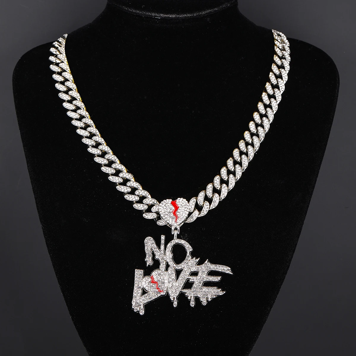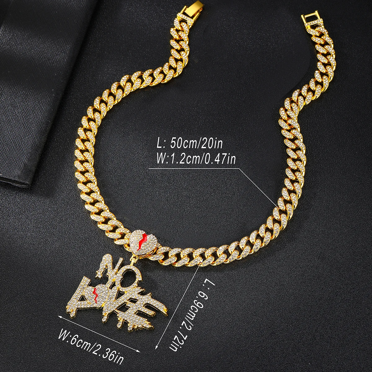 Men's Rhinestone Heart Split Red enamel "NO LOVE" Hip hop necklace with 13MM classic Cuban chain for rapper Jewelry gift